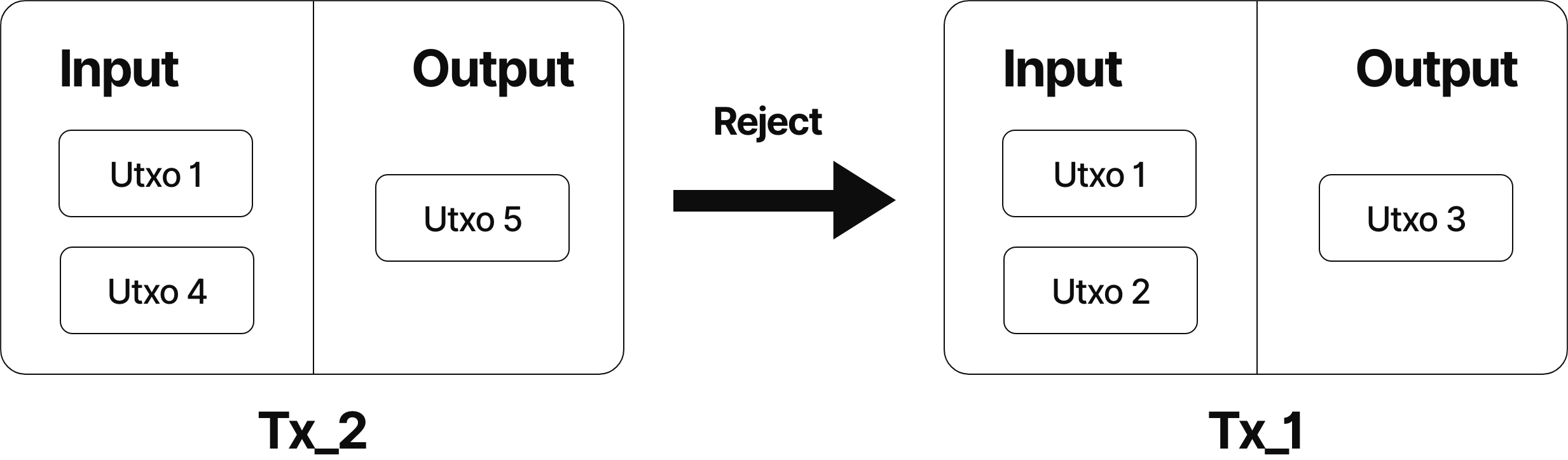 After transaction TX1 enters the memory pool, transaction TX2 arrives. Since TX2 and TX1 use the same UTXO1 as input, and TX1 enters the node’s memory pool one step earlier than TX2, according to the foresight principle, TX2 is rejected by the node.