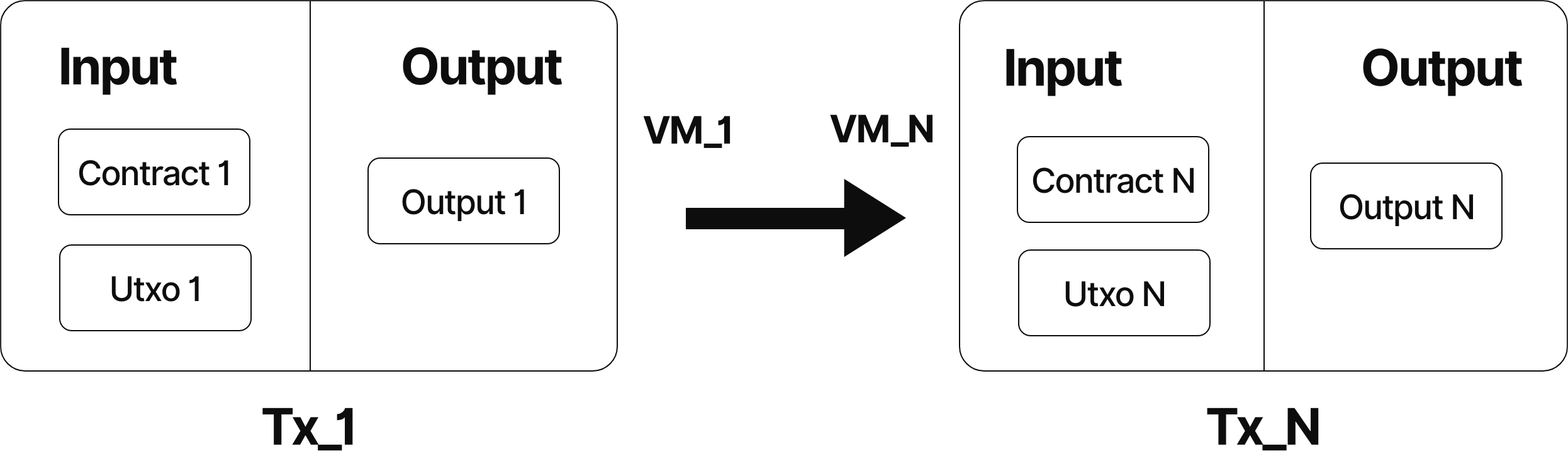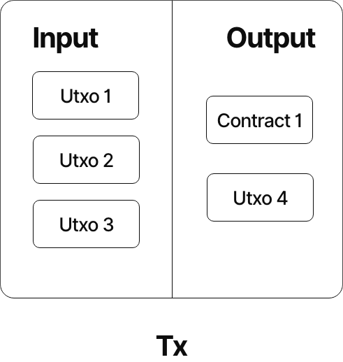 As shown above, UTXO1 has a unique identifier TXID1+outputIndex1, and contract1 is a newly created contract. We can combine the identifier of UTXO1 and the contract code of contract1 as the ID of the contract contract1. In actual contracts, hash(TXID1 + outputIndex1) + codeHash is generally used as the ID.